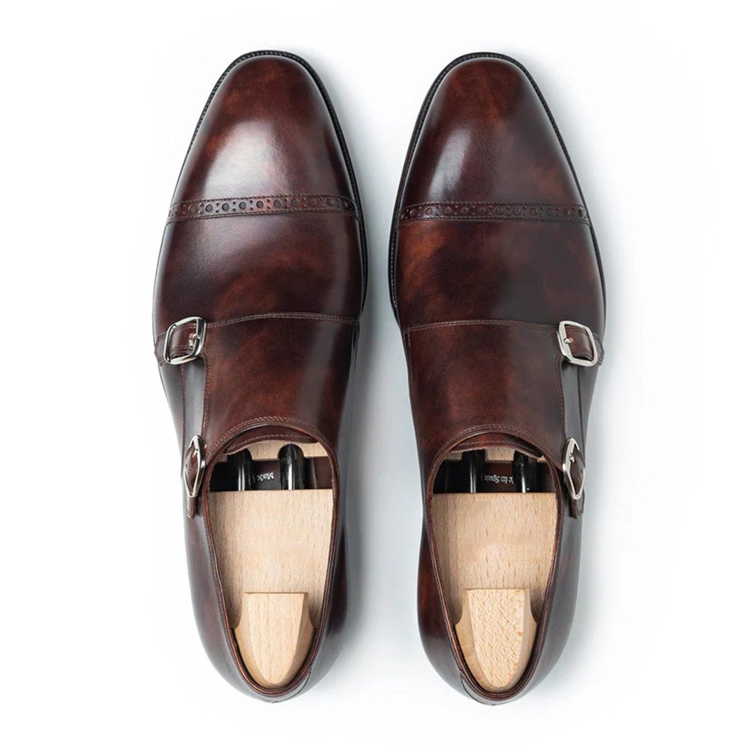 Double monk with punched cap toe made with Museum Calf leather in Brown color.