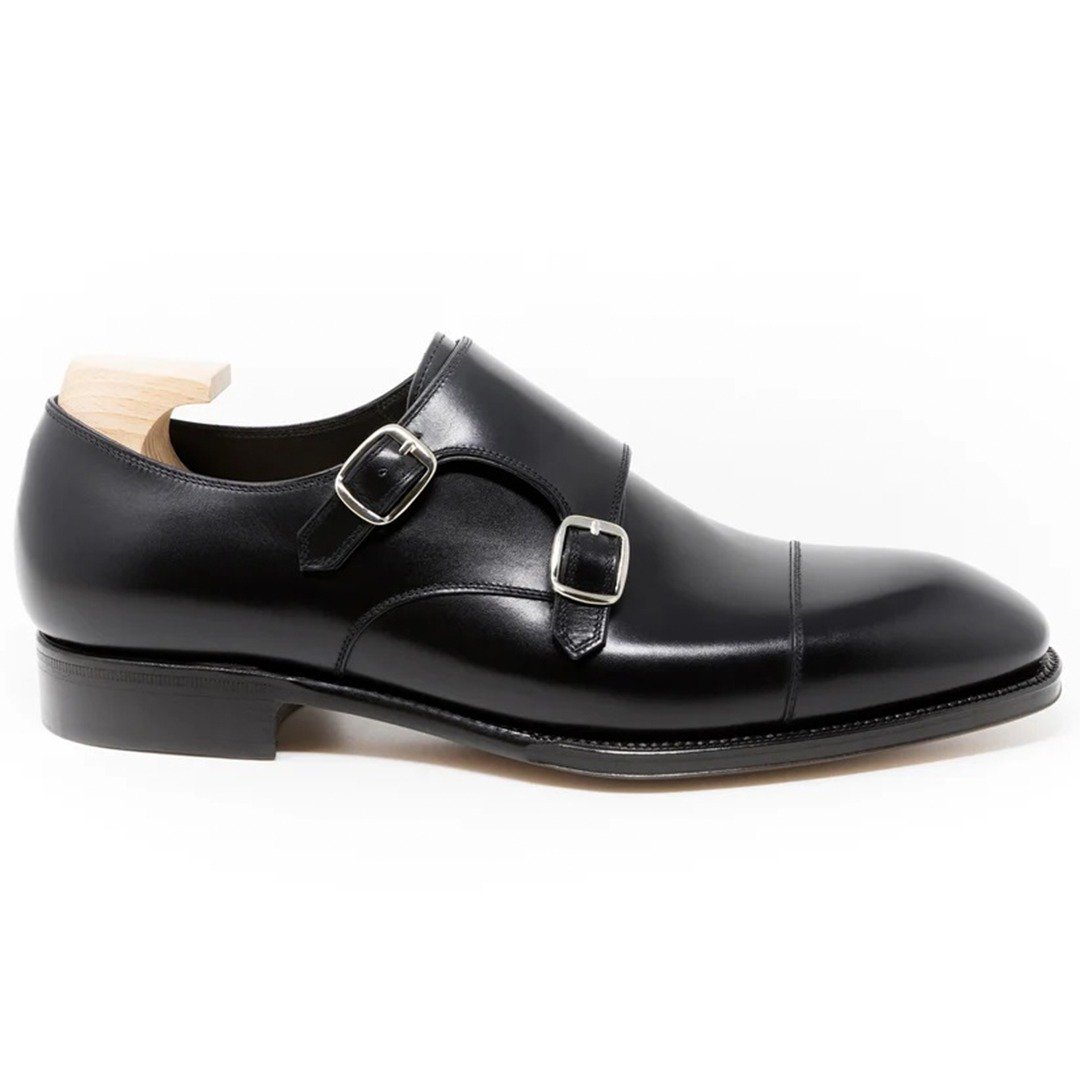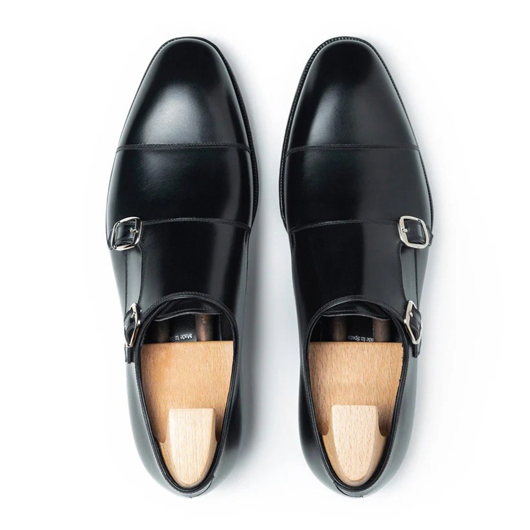 Double monk strap made in Boxcalf Leather using French Calf from Anonnay tannery in black color, calf lining with vegetable tanned leather insoles finished with single leather closed channel sole to get more elegant finishing.