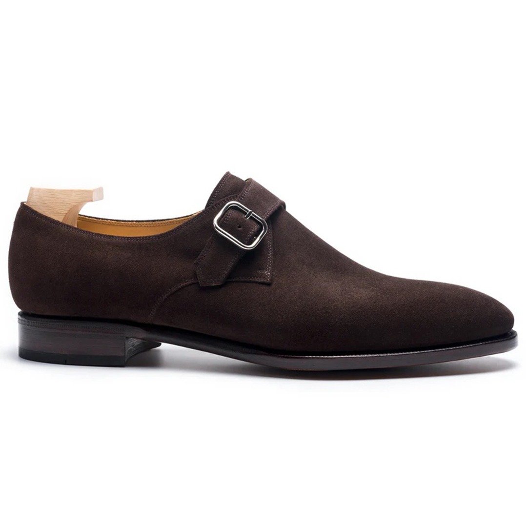A single buckle monk strap shoe with a plain front (Silver Buckle) using suede leather from Charles Stead tannery in Brown color.